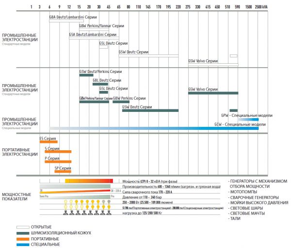- GSW 15d-22d Эта серия была разработана для наибольшей конкурентноспособности на рынке, который требует обширных областей применения с невысокими требованиями по мощности. Широкий ассортимент дополнительного оборудования, малые размеры, продолжительное время работы и версия для сдачи в аренду делают эти агрегаты очень привлекательным продуктом.